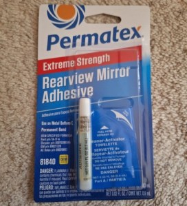 次に、粗さが違う紙やすりをいくつか持ってきて、古い接着剤をできるだけ取り除いた(ちょっと金属部分に傷がいったかも)。それから車のパーツ屋さんでバックミラー修理専用の接着剤(Permatex Rearview Mirror Adhesive)を買って、準備は完了。